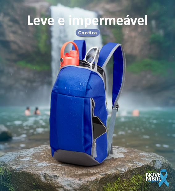 Mochila confeccionada em poliéster impermeável com fechamento em zíper e capacidade máxima de 14 litros. Conta com bolso frontal com abertura lateral, uma alça superior de mão em nylon e duas alças para as costas do mesmo tecido da mochila. Tam: 44x16x12cm.