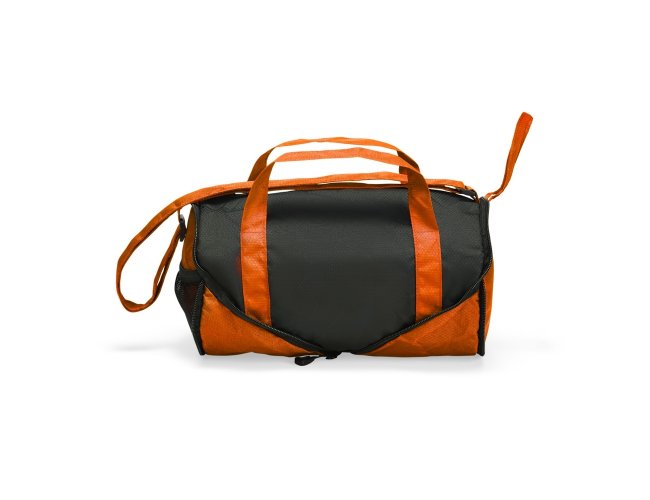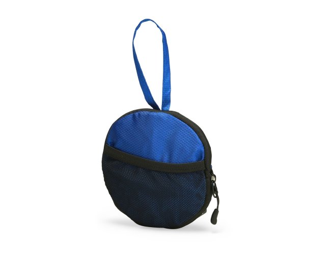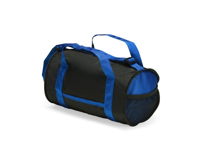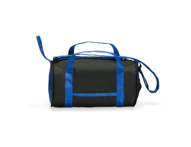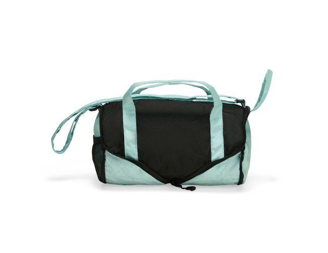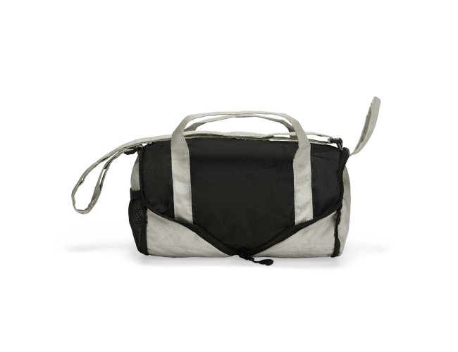 Bolsa esportiva em poliéster 420D resistente à água, com fechamento em zíper e capacidade de 6 litros. Quando dobrada, mantém formato arredondado com bolso telado e uma alça de mão para transporte. Aberta, possui dois bolsos externos: um frontal aberto e outro lateral em tela de nylon com elástico. Conta ainda com duas alças laterais fixas e uma alça transversal ajustável.