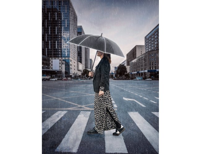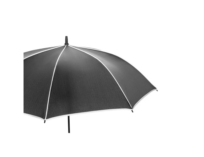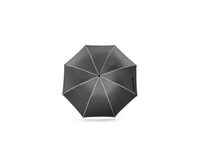 Guarda-chuva de 27" em poliéster 100% reciclado (rPET) pongee 190T, com varetas e haste em fibra de vidro. Guarda-chuva com abertura automática e à prova de vento, permitindo-o ser resistente em qualquer eventualidade. Possui detalhes refletivos em torno do guarda-chuva. Fornecido numa bolsa individual.