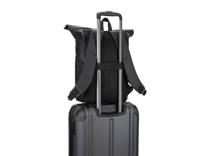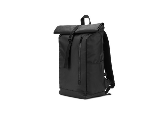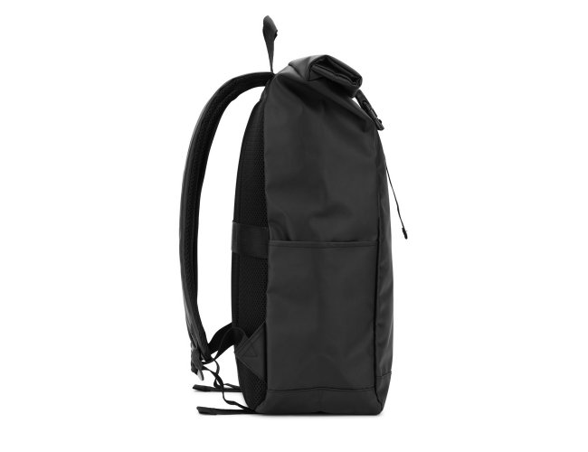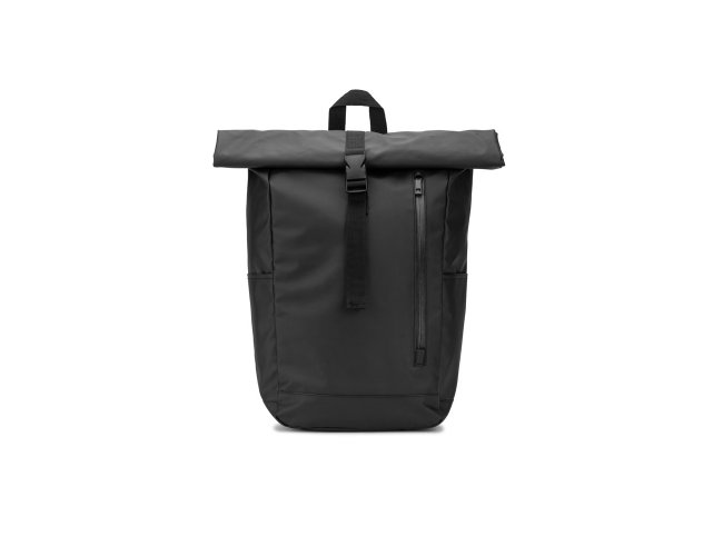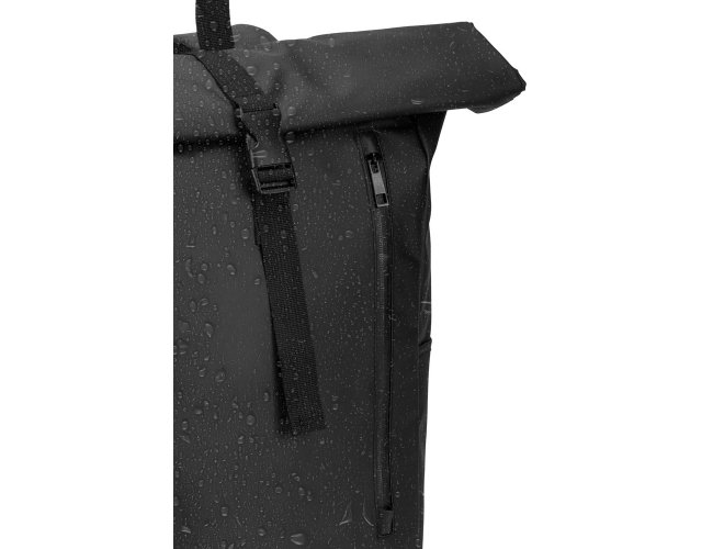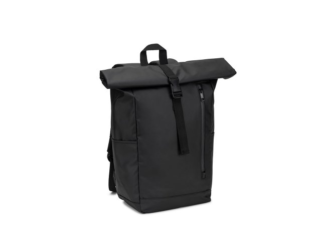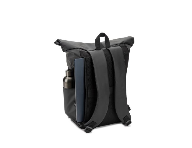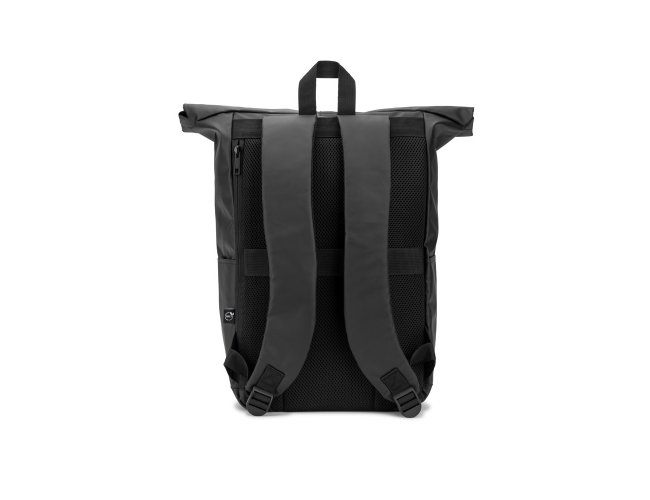 Mochila "Roll top", um design em sistema de fecho que permite enrolar a parte superior até ajustar ao volume da mochila. Composta por poliéster reciclado 600D de alta densidade com revestimento resistente à água e forro em poliéster reciclado 210D. Possui um compartimento principal com bolso almofadado para notebook até 14", bolsos laterais e um bolso frontal com zíper impermeável. O acesso ao notebook pode ser feito pelo compartimento principal ou na parte posterior através do zíper. A parte posterior em malha incorpora uma alça trolley. Capacidade até 20 L.