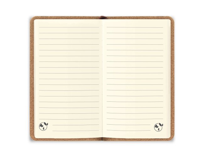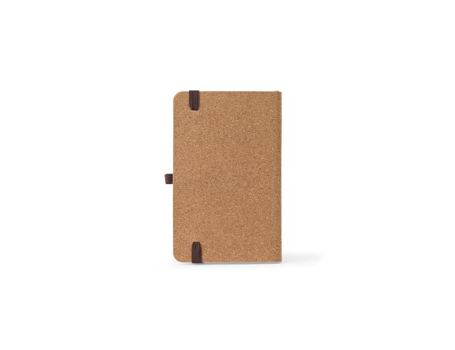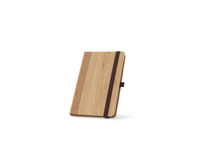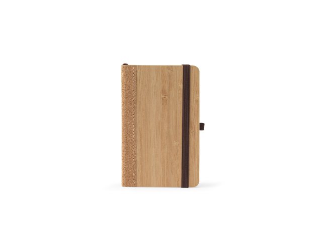 Caderno de bolso de capa dura em folha de bambu e cortiça. Contém 160 páginas, em papel 100% reciclado, pautadas cor de marfim, fita separadora, suporte para esferográfica (não inclusa) e elástico para fecho do caderno.