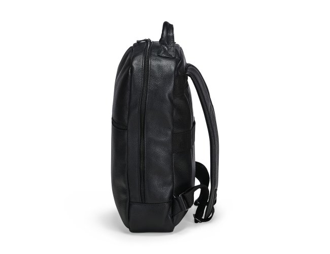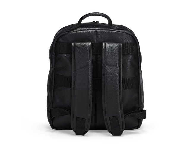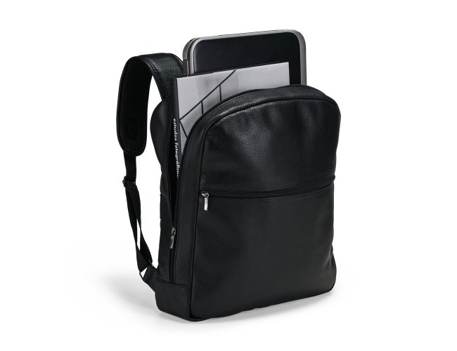 Mochila confeccionada em couro, revestimento interno em poliéster, fechamento em zíper e capacidade máxima de 14 litros. Possui divisória interna para notebooks de até 14 polegadas, bolso frontal com fechamento em zíper, alça superior reforçada, alças ajustáveis para as costas com revestimento em tecido acolchoado e faixa de engate em nylon para acoplar em malas. Acompanha uma plaquinha em couro flexível presa a um cordão de nylon.