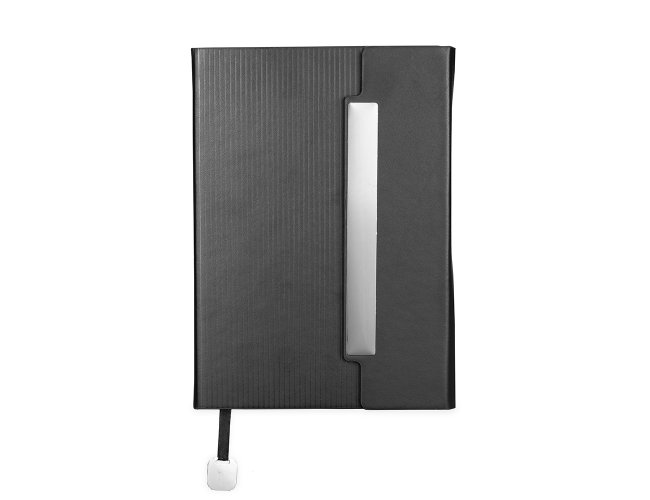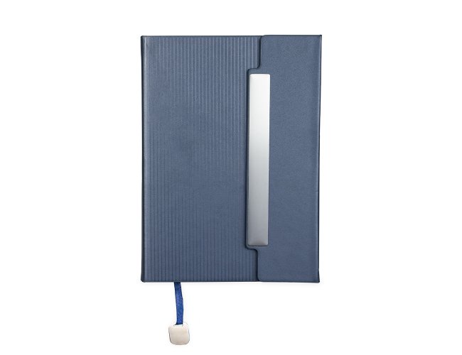 Caderneta com capa em couro sintético levemente texturizada, marca-páginas em fita de cetim com plaquinha metálica decorativa, aba de fecho magnético com placa metálica e cerca de 96 folhas marfim pautadas.