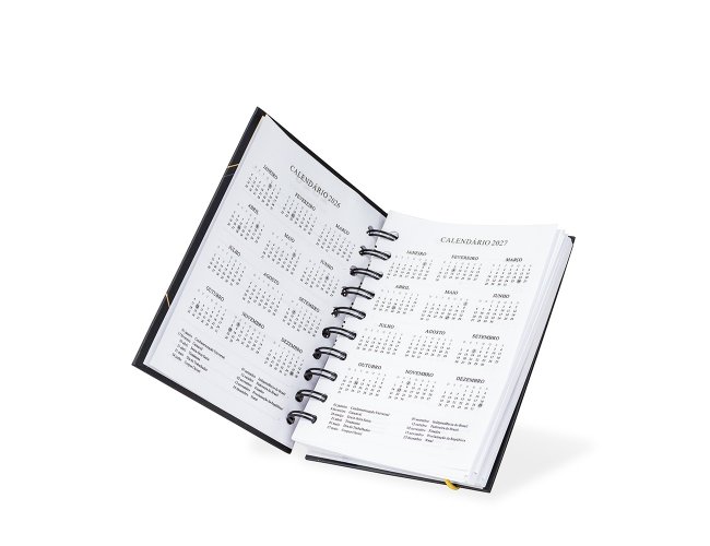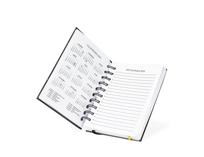 Agenda diária 2026 com capa dura, elástico de fechamento, marca-páginas de fita de cetim e encadernação Wire-O. Conta ainda com páginas dedicadas a dados pessoais, calendários de 2026 até 2028, além de listas de metas, planejamento mensal e contatos.