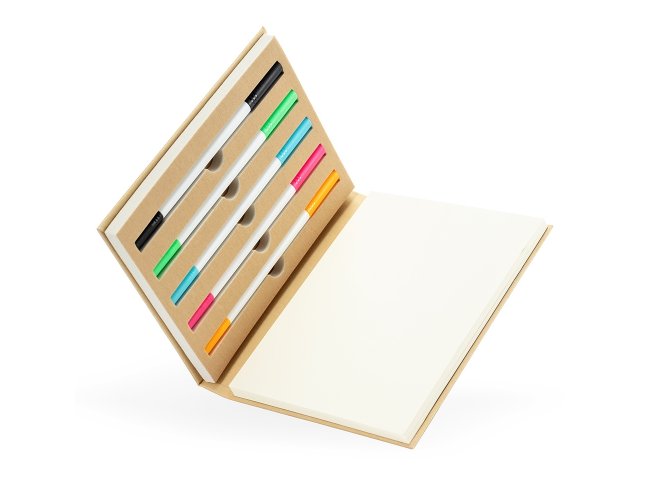 Bloco de anotações com capa dura em kraft e fechamento por elástico. Possui aproximadamente 80 folhas de tonalidade marfim sem pautas e cinco canetas coloridas de ponta dupla: uma fina e outra tipo pincel.
