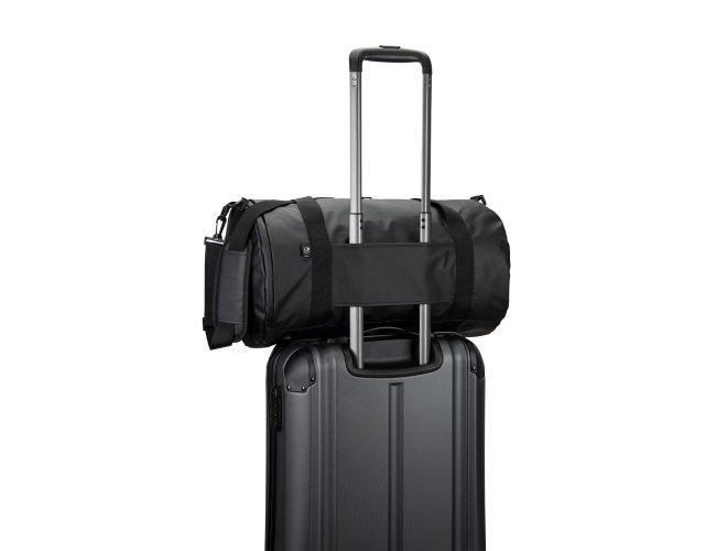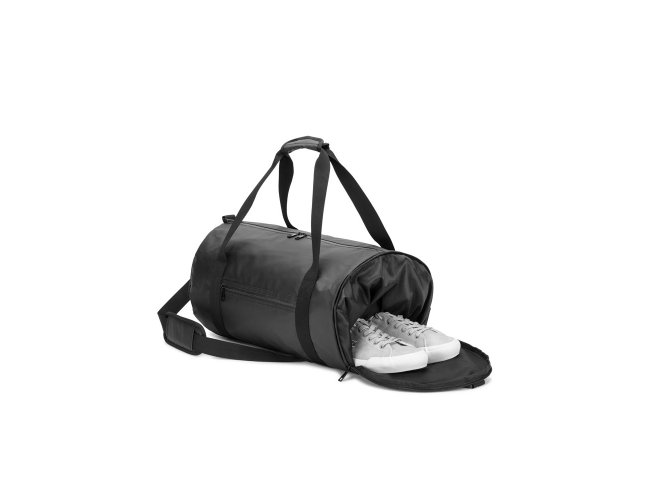 Bolsa esportiva em formato cilíndrico adequado para levar o imprescindível para os seus treinos e atividades. Composto por poliéster reciclado 600D de alta densidade, com revestimento resistente à água, e forro em poliéster reciclado 210D. Possui um compartimento principal espaçoso para o seu equipamento, um compartimento lateral para sapatos ou sapatilhas e um bolso frontal. Possui pegas reforçadas e almofadadas, e a alça, removível, em webbing com acolchoamento, tornam o transporte desta bolsa mais prático. A parte posterior incorpora uma alça para trolley. Os fechos da mochila são impermeáveis garantindo uma maior proteção. Capacidade até 32 L.