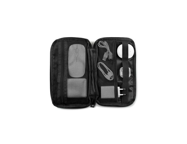 Bolsa organizadora para acessórios tecnológicos, recomendada para cabos, carregadores e pequenos dispositivos. Composta por poliéster reciclado 600D de alta densidade e forro em poliéster reciclado 210D. O compartimento principal contém vários bolsos para organizar individualmente todos os seus acessórios de maneira personalizada e funcional.