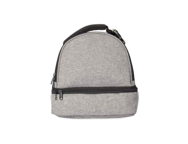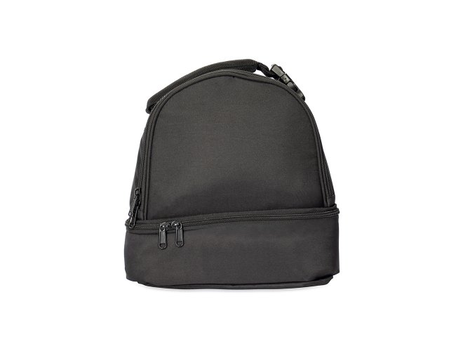 Bolsa térmica dupla feita em poliéster 300D resistente à água, com capacidade total de 12 litros divididos em dois compartimentos revestidos internamente em PEVA: o superior comporta até 5 litros e o inferior, até 3 litros. Possui alça superior com engate em plástico.