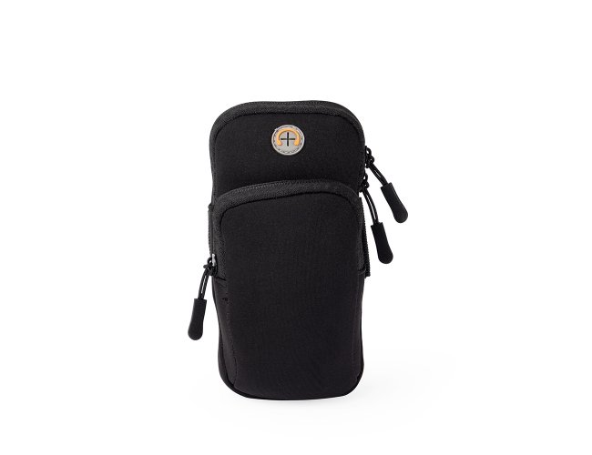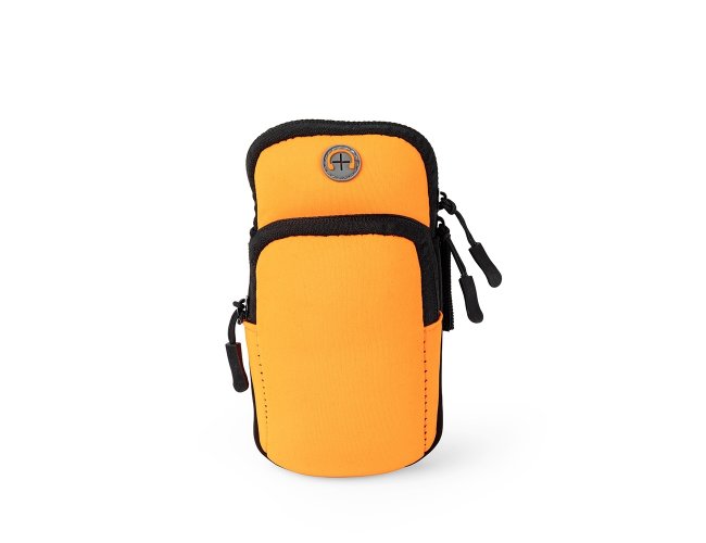 Braçadeira esportiva em neoprene impermeável. Possui dois compartimentos com fechamento em zíper: um principal, com saída para fones de ouvido, e outro na parte frontal, além de alça elástica com velcro para ajuste no braço.