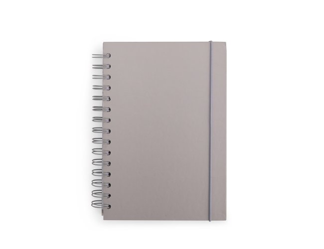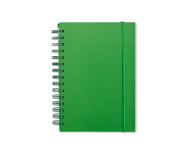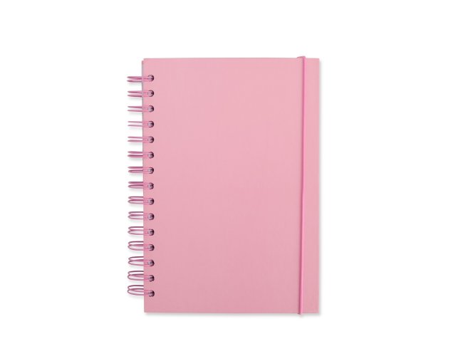 Caderno com capa dura em couchê, encadernação wire-o, marcador de páginas em fita de cetim e elástico para fechamento. Conta com aproximadamente 160 folhas brancas com pauta.