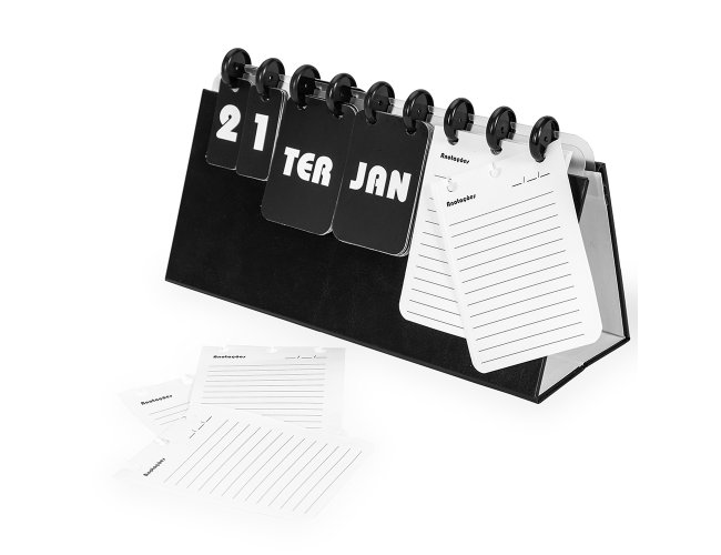 Calendário permanente de mesa com base em percalux e encadernação em discos plásticos reposicionáveis. Inclui fichas para marcação dos dias do mês em números, do dia da semana em texto e do mês também em texto, além de um bloco de anotações com cerca de 30 folhas brancas pautadas.