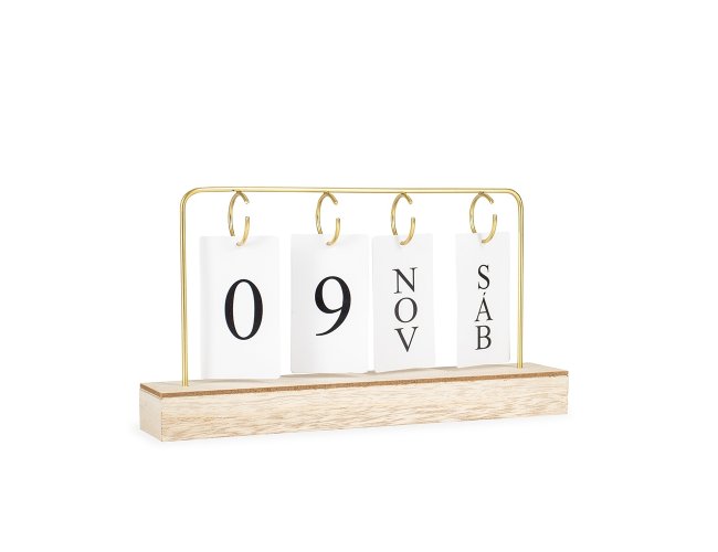 Calendário permanente de mesa com base feita em MDF e moldura de ferro. Conta com fichas em papel cartão que permitem montar a data, trazendo o dia em números e o mês e os dias da semana em versões abreviadas.