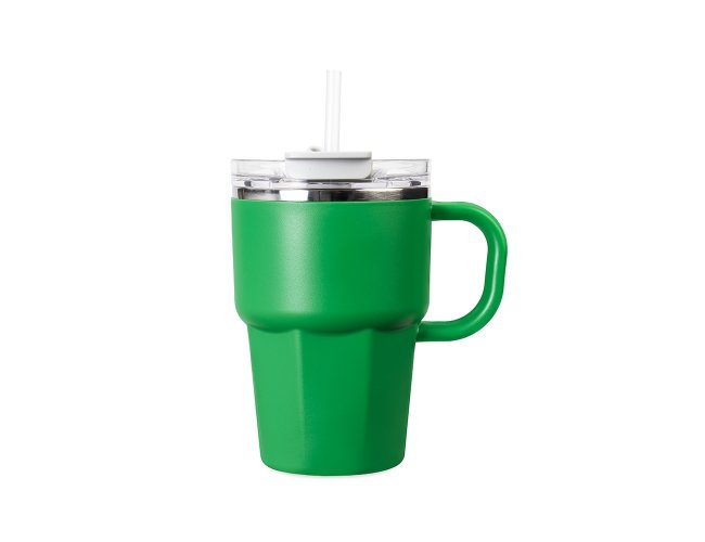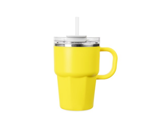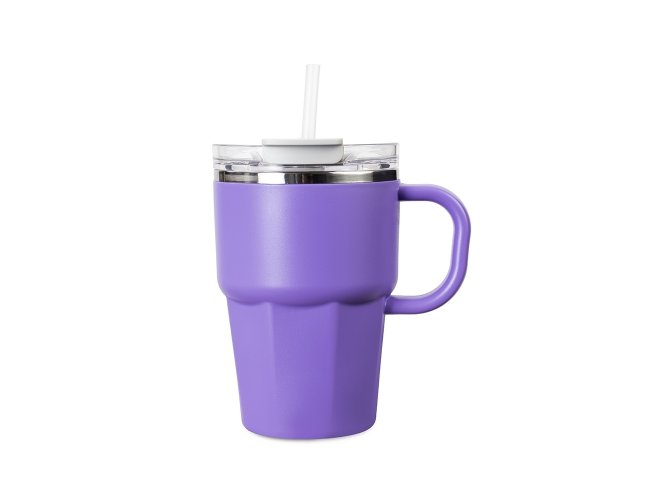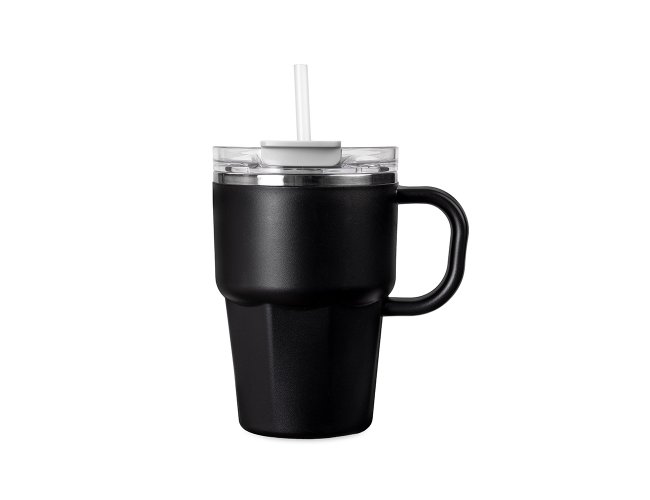 Caneca de parede dupla com interior em inox 304, revestimento externo e alça em plástico polipropileno (PP) e capacidade máxima de 550ml. Possui tampa de pressão em AS com protetor para o bocal em PP, além de acesso para canudo e anel de vedação em silicone, permitindo duas formas de consumo de bebidas. Acompanha canudo plástico.