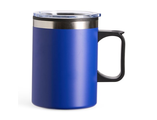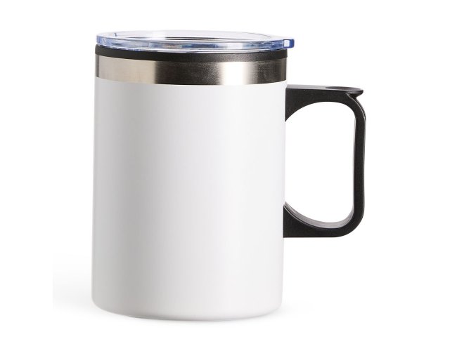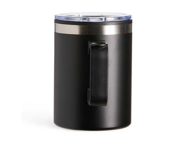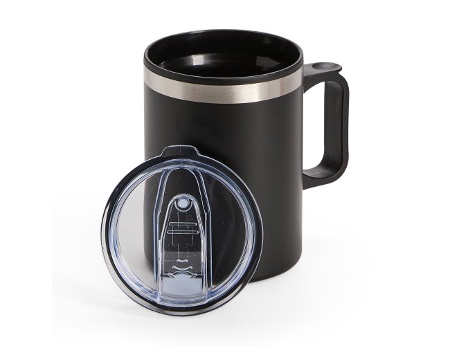 Caneca plástica com capacidade de até 375ml e revestimento externo em inox que reduz o contato direto com a temperatura dos líquidos. Conta com tampa plástica com bocal e trava de segurança, além de base emborrachada antiderrapante.
