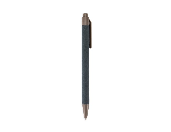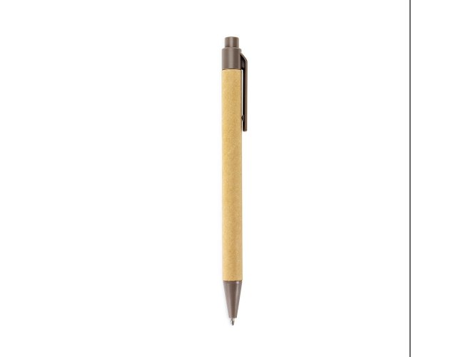 Caneta com corpo em papelão, ponteira e clip em plástico ABS, com acionamento por clique e carga esferográfica azul de 1,0mm.