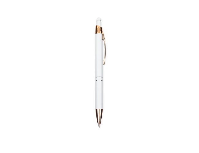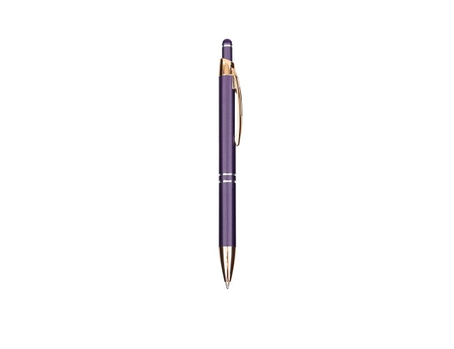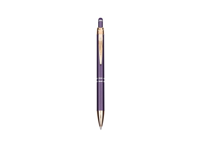 Caneta em metal com detalhe emborrachado no topo para a interação com dispositivos de telas sensíveis ao toque. Conta com acionamento por clique e carga esferográfica azul de 1,0mm.