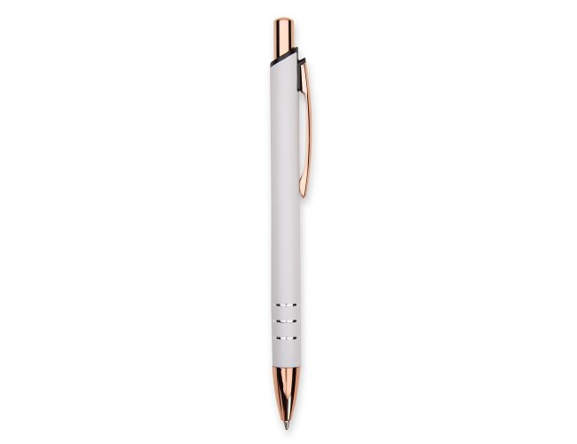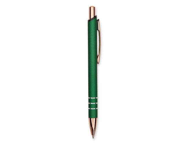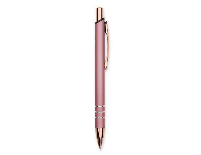 Caneta metálica com acionamento por clique e carga esferográfica azul de 1,0mm, oferecendo uma pegada leve para uma escrita mais precisa.