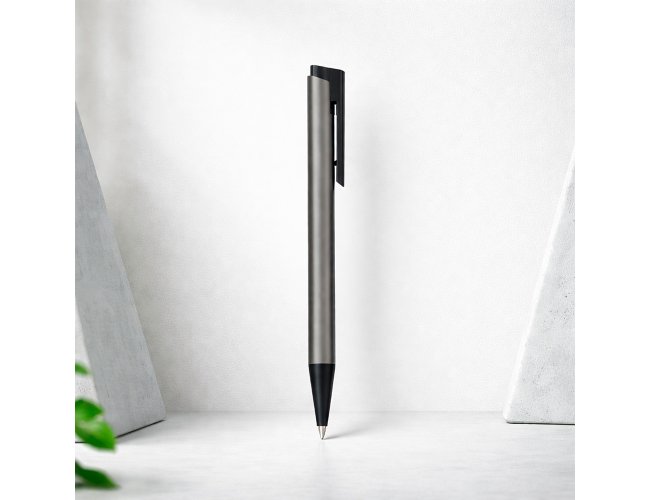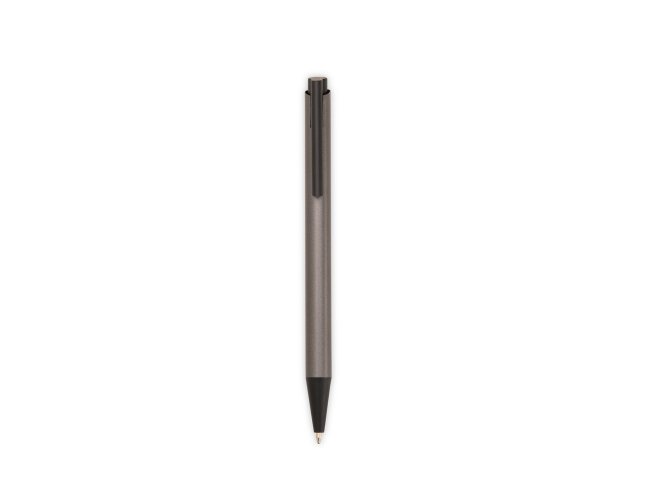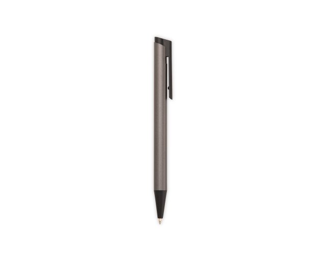 Caneta metálica com ponteira, clip e acionamento em plástico. Possui carga esferográfica azul de 1,0mm e acionamento por clique.