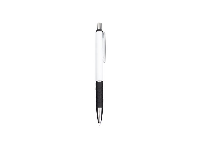 Caneta metálica com detalhe emborrachado próximo à ponta. Conta com acionamento por clique e carga esferográfica azul de 1.0mm.