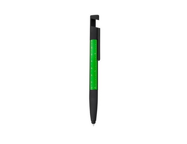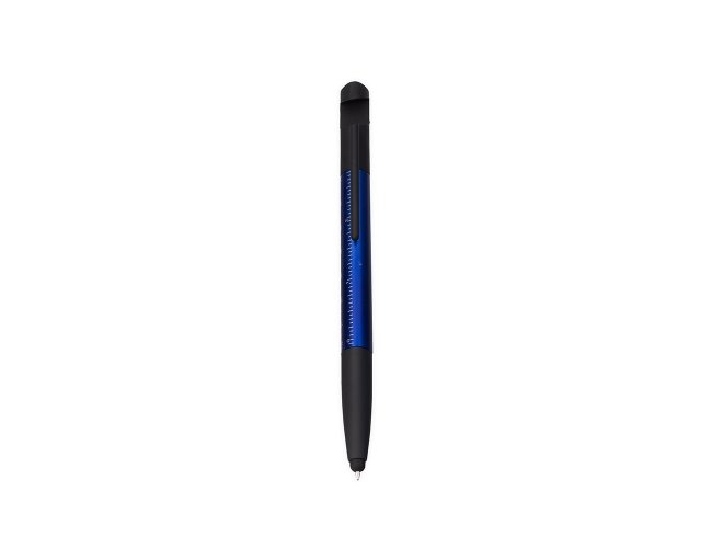 Caneta plástica triangular com ponteira emborrachada para interação em dispositivos de telas sensíveis ao toque. Possui clip com revestimento em feltro no topo, ideal para limpeza de tela, além de abertura que funciona como suporte para celular. Conta ainda com marcação de régua de 7 cm no corpo, acionamento por rotação e carga esferográfica azul de 1,0mm.