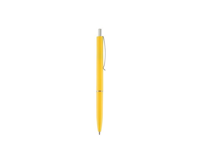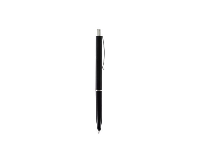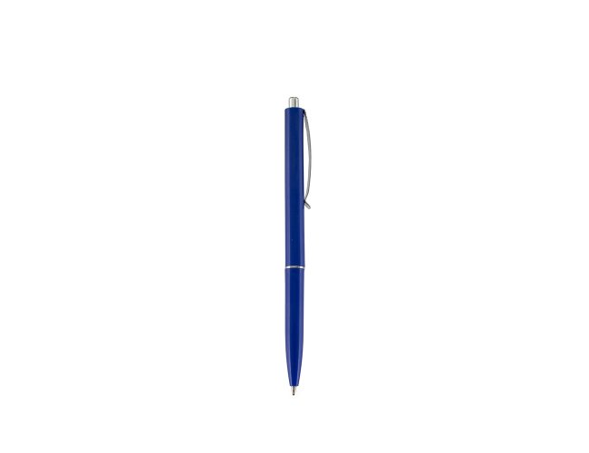 Caneta plástica com clip e ponteira em metal. Possui acionamento por clique e carga esferográfica azul de 1.0mm.