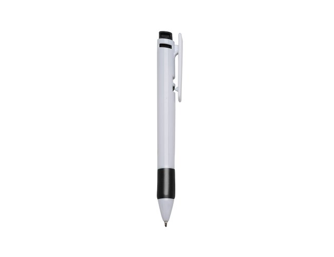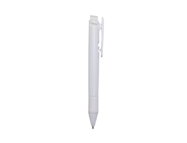 Caneta plástica inteira branca com detalhes emborrachado e clip colorido. Possui dois traços vazados na parte superior e acionador com detalhes em relevo. Aciona por clique, para destravar bastar pressionar o clip.