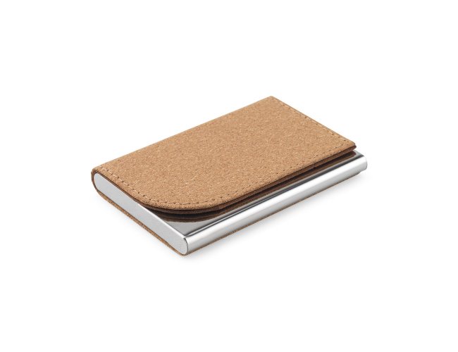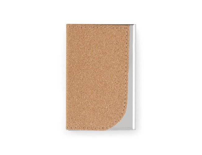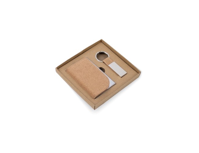 Conjunto composto por um porta-cartões e um chaveiro, ambos em metal e cortiça. O porta-cartões tem capacidade até 7 cartões. Fornecido em caixa presente de papel kraft reciclado. A cor e o resultado da impressão nos materiais naturais pode variar entre produtos.