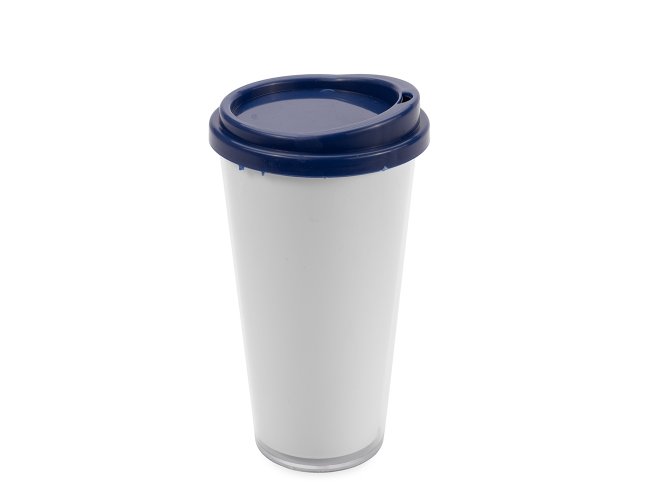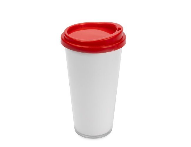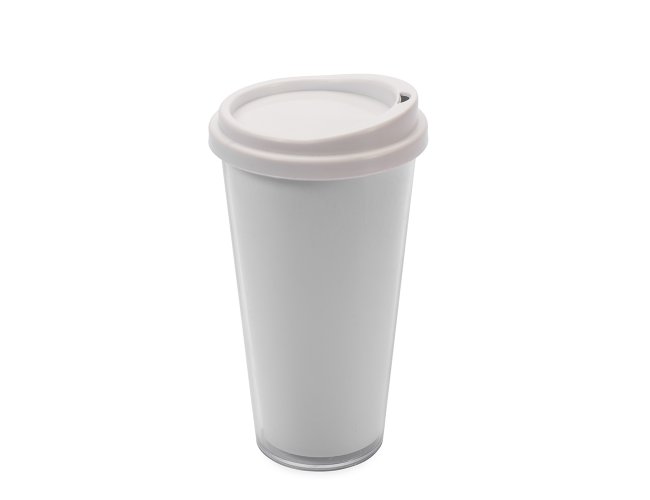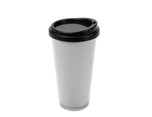 Copo em plástico com capacidade máxima de 400ml. Conta com duas camadas: uma externa, transparente, e outra interna, na cor branca, o que ajuda a evitar o contato direto com a temperatura do líquido. Além disso, possui tampa rosqueável com abertura no bocal.