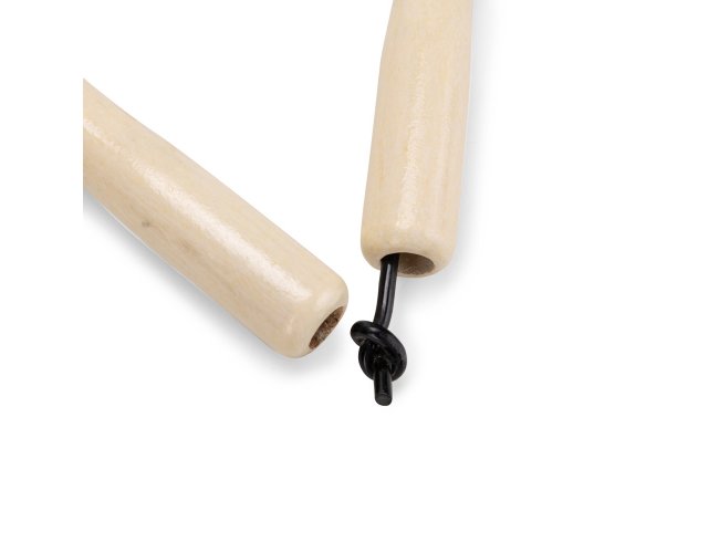 Corda de pular feita em PVC, com cabos em madeira e comprimento total de aproximadamente 2,5 metros.