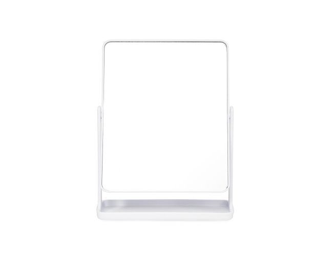 Espelho de mesa giratório retangular sem aumento. Possui estrutura em plástico e base com espaço para organizar pequenos objetos.
