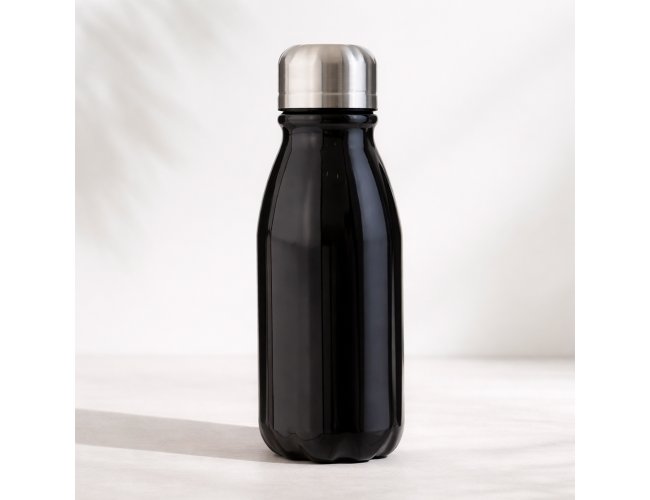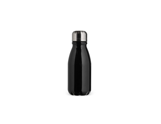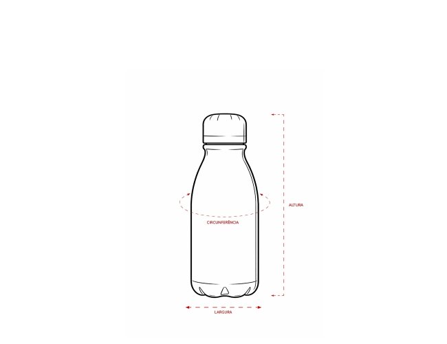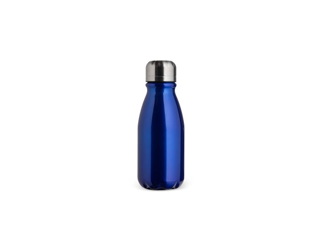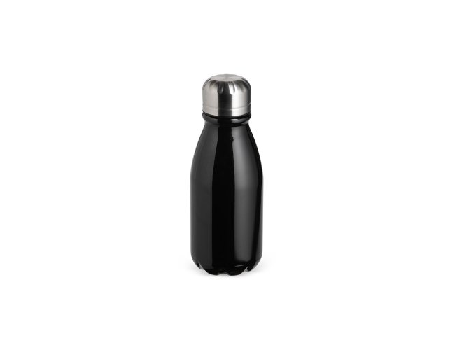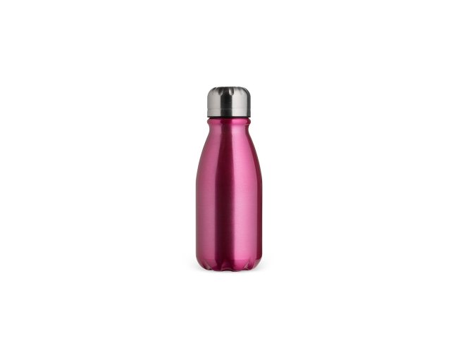 Garrafa em alumínio com tampa rosqueável e capacidade máxima de 400ml.