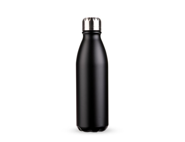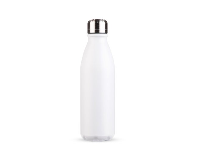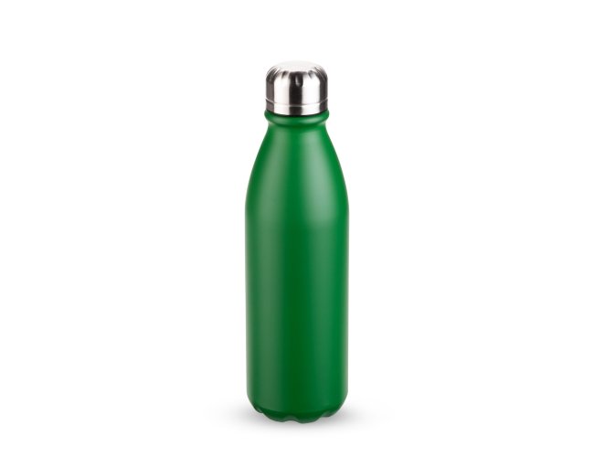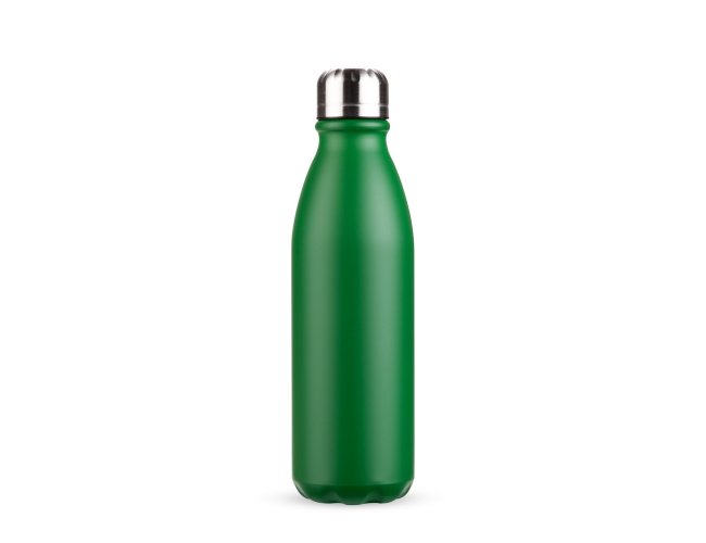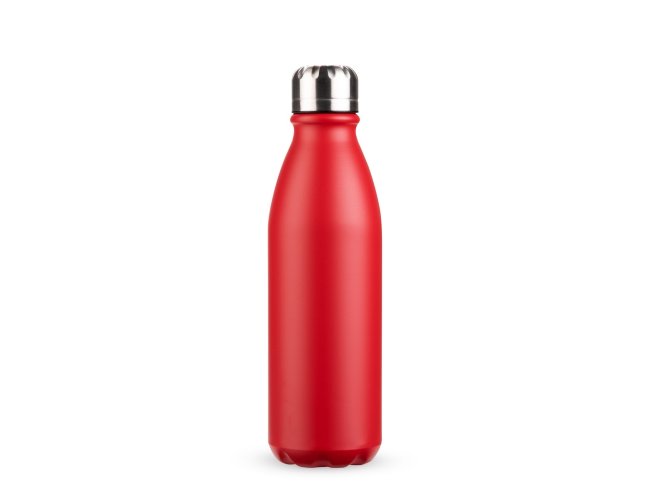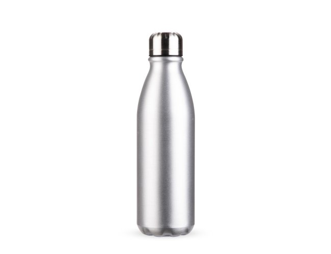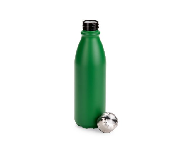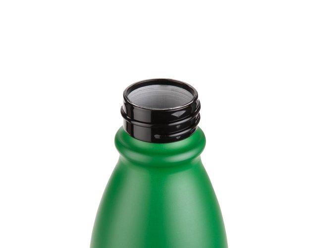 Garrafa em alumínio com acabamento em verniz fosco, revestimento plástico no bocal e capacidade para até 750ml. Possui tampa rosqueável em alumínio com interior em plástico.