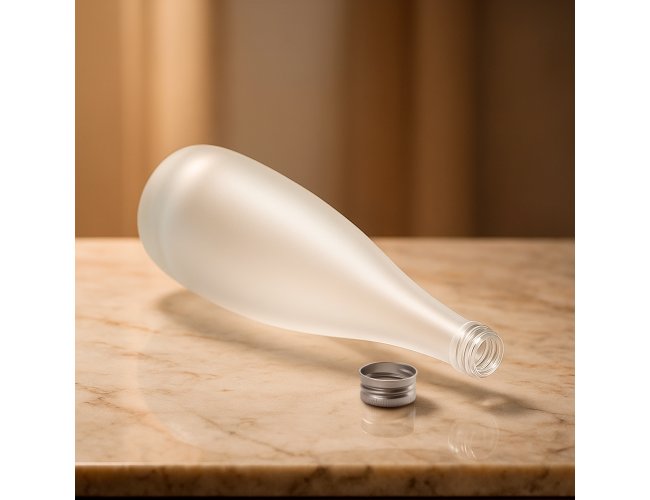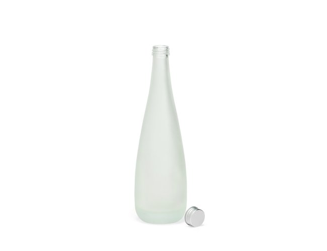 Garrafa de vidro com acabamento fosco, tampa rosqueável em alumínio e capacidade máxima de 550ml.