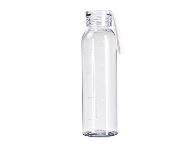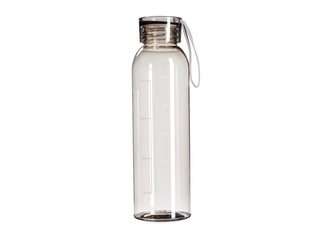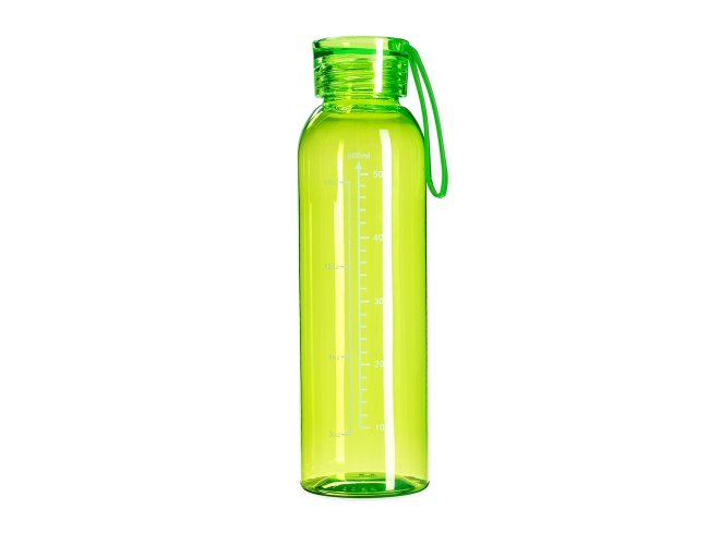 Garrafa feita em plástico livre de BPA com capacidade máxima de 640ml e marcação de volume impressa de até 600ml. Conta com tampa plástica rosqueável com alça de silicone fixa.