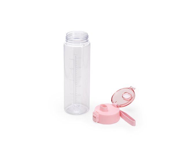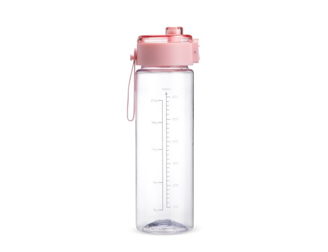 Garrafa feita em plástico livre de BPA com capacidade máxima de 750ml e marcação de volume impressa de até 700ml. Possui tampa rosqueável em polipropileno (PP) com protetor para o bocal, botão de acionamento e alça de mão em silicone.