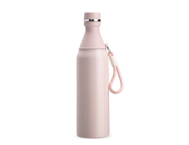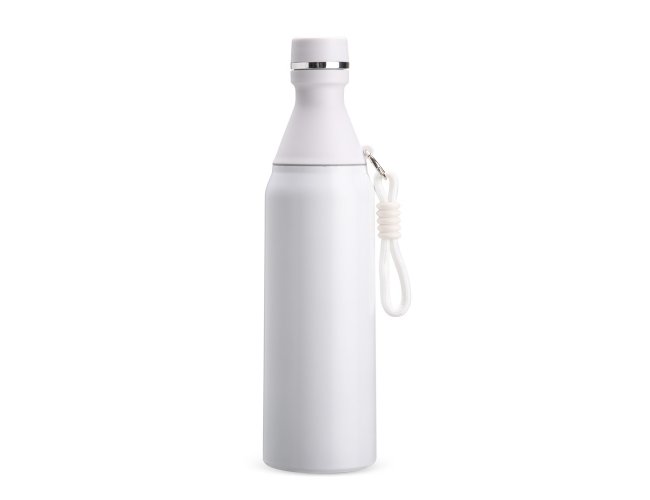 Garrafa térmica em inox com capacidade para até 500ml. Possui estrutura de parede dupla, ideal para conservar a temperatura de líquidos por mais tempo. Conta com tampa rosqueável e compartimento removível em plástico, permitindo o uso como copo. Acompanha alça em nylon com detalhes em plástico e mosquetão metálico.