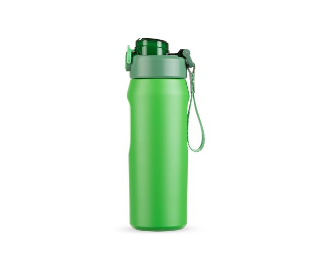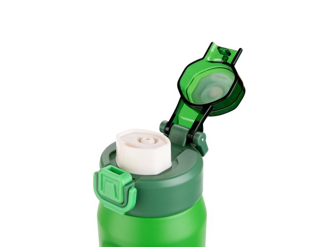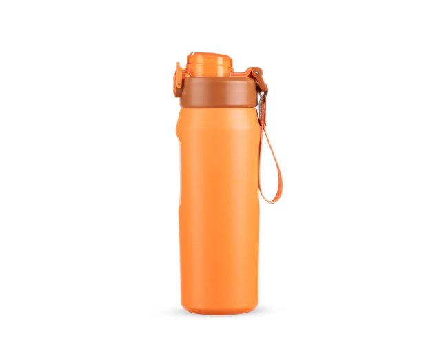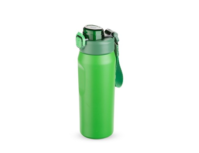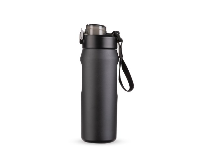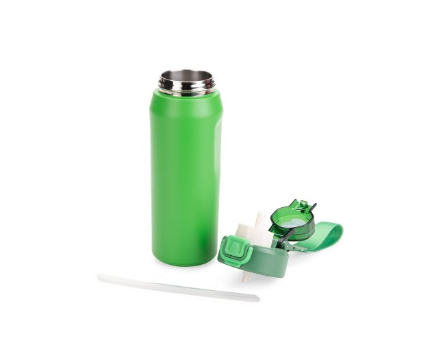 Garrafa térmica em inox SUS 304. Conta com estrutura de parede dupla e vedação a vácuo, ajudando a conservar a temperatura dos líquidos por mais tempo. Possui sistema de canudo com acionamento e dois modos de uso para beber, sendo um deles através da abertura principal e outro por meio do bico em plástico polipropileno (PP) integrado à tampa. Sua tampa é rosqueável em plástico, com protetor para o bocal e para o bico suporte do canudo, além de trava de segurança que impede a abertura do protetor. Conta com base antiderrapante para maior estabilidade, alça de PVC com fibra sintética e acompanha canudo de silicone para encaixe interno na tampa.