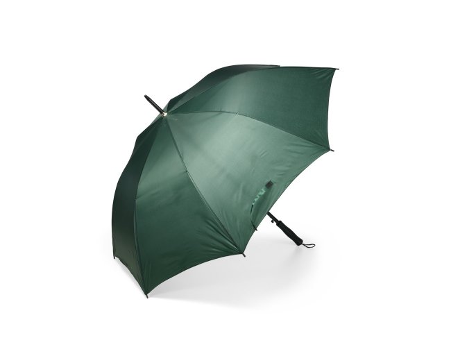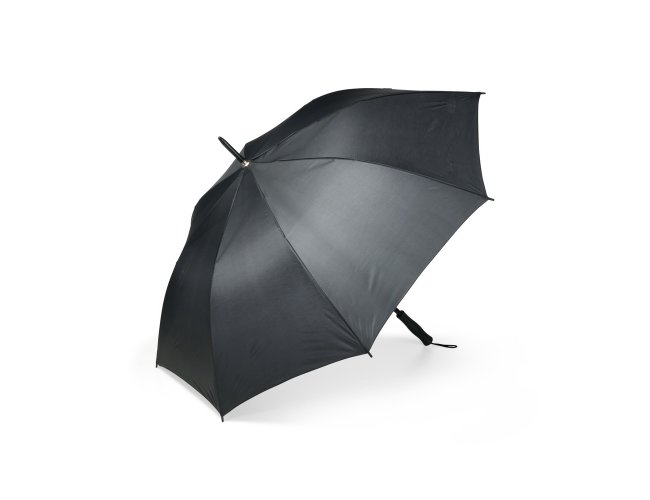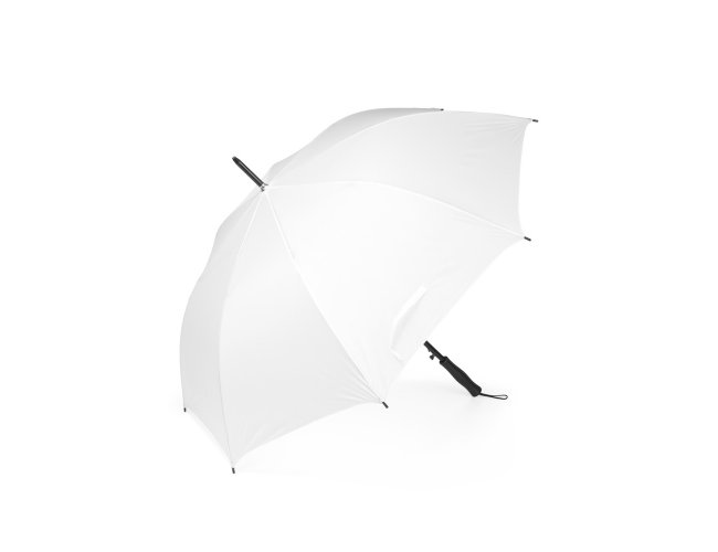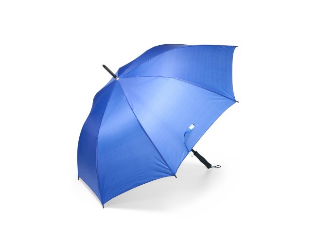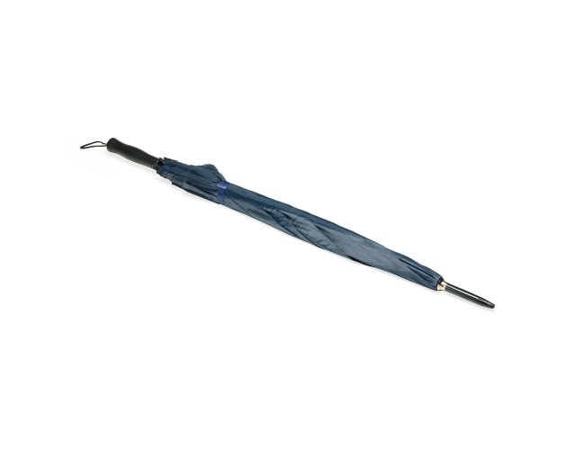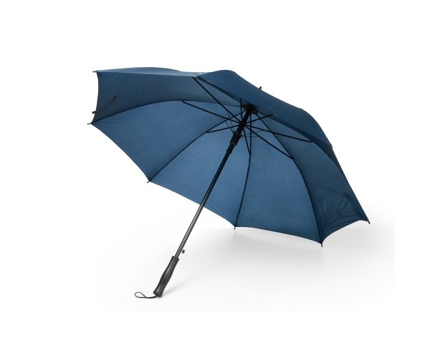 Guarda-chuva em poliéster com abertura automática, estrutura metálica com oito varetas e pegador em plástico com alça de nylon fixa na extremidade.