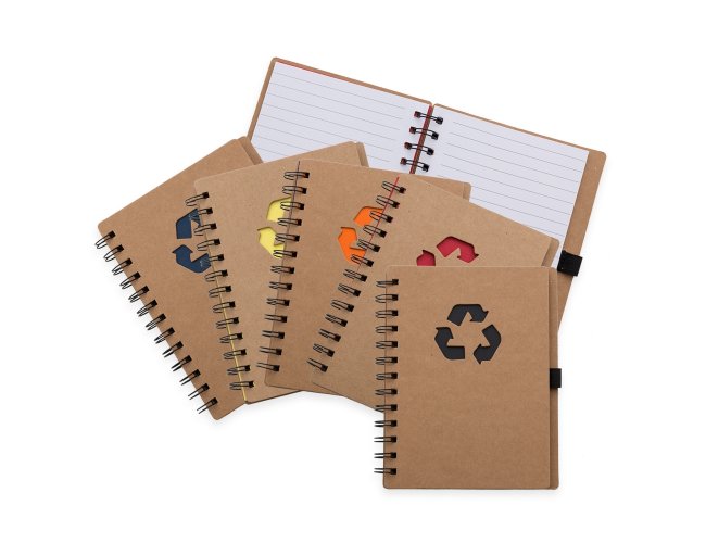 Caderno ecológico com símbolo reciclado na capa, acompanha folhas coloridas estilo folhas de guarda nas cores: vermelho, amarelo, laranja, azul, verde e preto, possibilitando selecionar a cor desejada como fundo do logo reciclado. Possui aproximadamente 70 folhas brancas pautadas com logo reciclado na lateral inferior das folhas, possui também elástico suporte para caneta, 18x15cm - XB12000.
