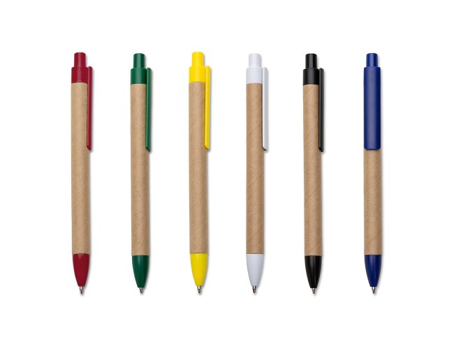 Caneta de papelão com detalhes plásticos, carga esferográfica azul 1.0 mm e acionamento por clique.