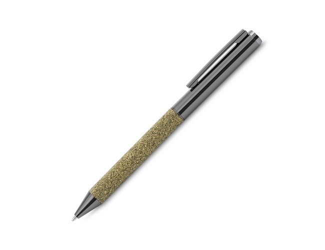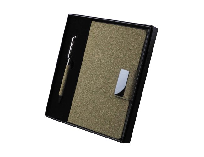Kit de Escritório composto por caderno tamanho A5, com capa em PU e detalhe em fibra de chá ou café, contendo 80 folhas pautadas de 70g/m². Acompanha caneta metálica com acabamento no mesmo material de fibra, formando um conjunto elegante e sofisticado. O kit acompanha estojo de papelão na cor preta.