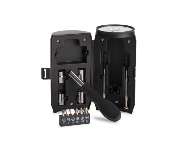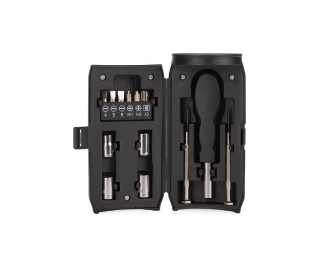 Kit de ferramentas com 13 peças em aço carbono. O conjunto conta com chave porta-bits magnética com cabo em polipropileno (PP), seis bits em formatos diferentes, sendo 3 de fenda, 2 Phillips e 1 adaptador para soquetes, além de duas chaves de precisão e 4 soquetes sextavados. Acompanha caixa plástica em formato de lata de bebida, com trava de fechamento.