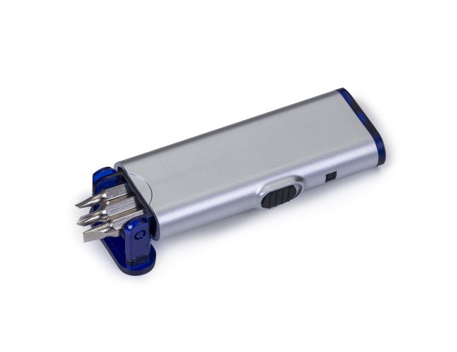 Kit ferramentas com três chaves de pontas duplas: uma em fenda e outra em formato Phillips. Possui estojo com encaixe magnético para as ponteiras de chave e lanterna em LED com chave liga/desliga.