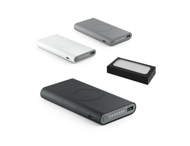 Bateria portátil em ABS com acabamento emborrachado e carregador por indução (wireless) super-rápido. Bateria de lítio com capacidade de 10.000 mAh e tempo de vida ≥ 500 ciclos. Os 15W de potência permitem carregamento super-rápido dos dispositivos móveis. Indicador de carga, porta de entrada microUSB, porta de entrada/saída USB-C e porta de saída USB-A. Incluso cabo USB-C para carregar a bateria. Compatível com dispositivos móveis com tecnologia de carregamento sem fios. Tam: 13,5x7,5x2cm. - SP57904.