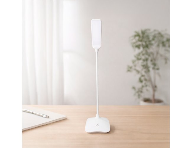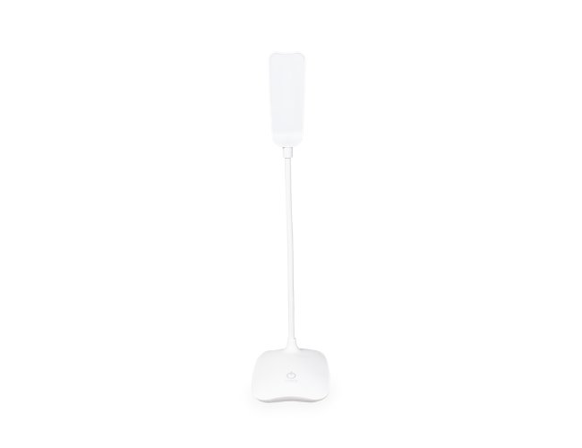 Luminária recarregável com 16 LEDs, estrutura em plástico e haste articulável em múltiplos ângulos. Possui acionamento por toque na base para a seleção de três níveis diferentes de iluminação e entrada Micro USB. Acompanha cabo micro USB para carregamento.