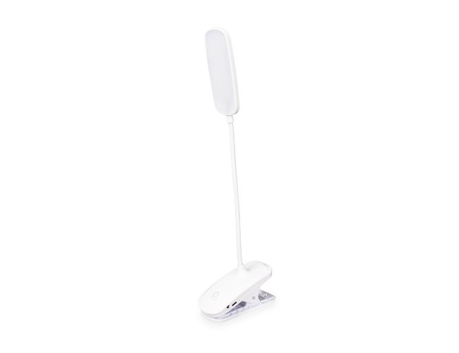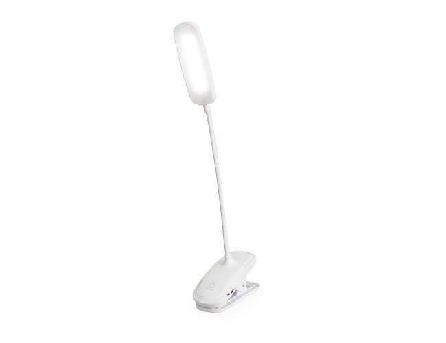 Luminária recarregável com 20 LEDs de cores mistas, sendo 10 quentes e 10 frios. Possui estrutura em plástico ABS com haste articulável em diferentes ângulos, presilha para fixação em superfícies planas e acionamento por toque na base para a seleção de três níveis diferentes de iluminação. Acompanha cabo USB-C para recarga.