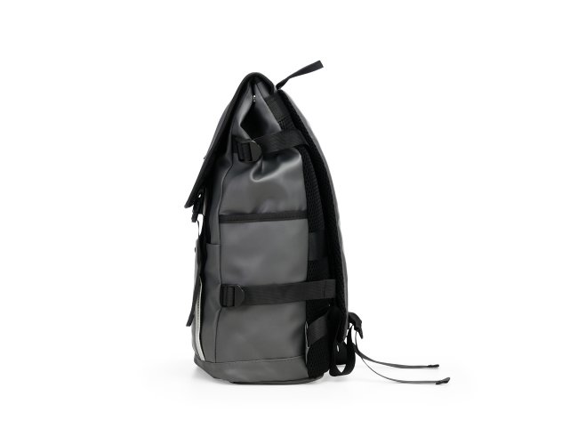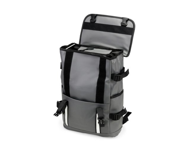 Mochila confeccionada em couro sintético com capacidade máxima de 18 litros. Possui abertura com zíper, tiras frontais em velcro e engate rápido. Apresenta divisória interna para notebook de até 15,3 polegadas, além de dois bolsos laterais e dois frontais, sendo um com fechamento em zíper próximo à abertura. Conta ainda com alças ajustáveis, costas acolchoadas em espuma respirável e engate traseiro para malas.