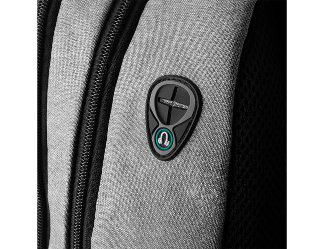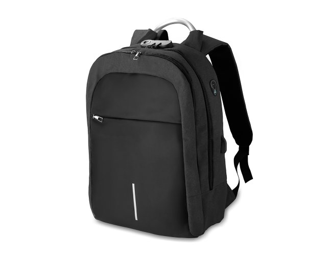 Mochila confeccionada em tecido externo de poliéster 300D e tecido interno em poliéster 210D. Possui fechamento em cadeado com segredo, bolso frontal com zíper, faixa reflexiva na parte frontal, saída USB e para fone de ouvido. Conta com alça de mão em metal, alça de ombro acolchoada, engate para mala de viagem e dois grandes compartimentos com fechamento em zíper, sendo um para pequenos