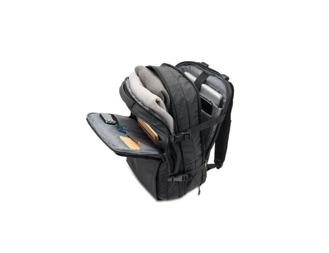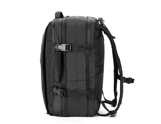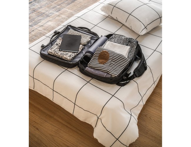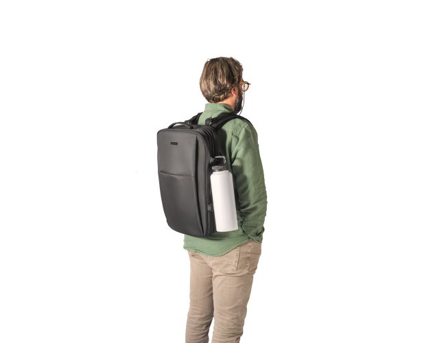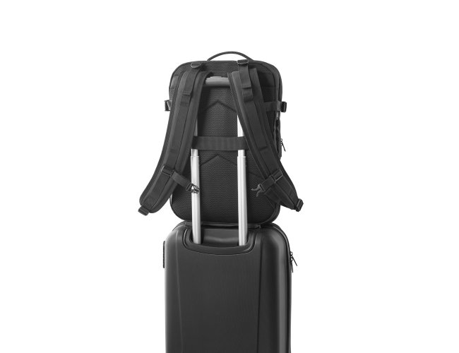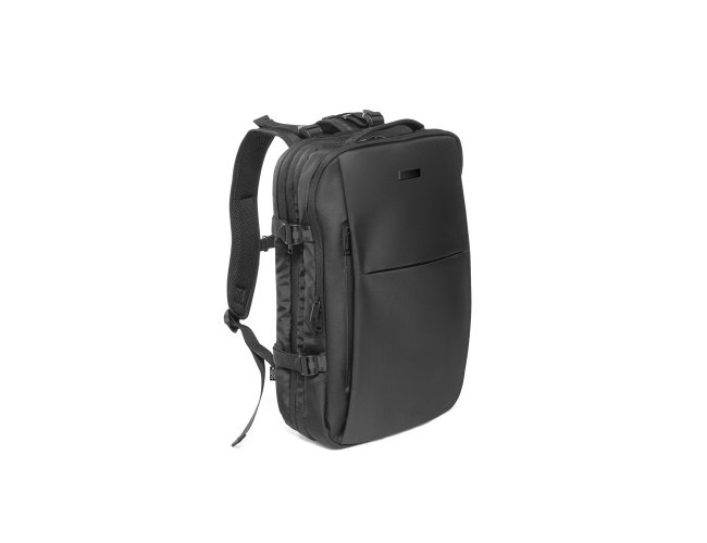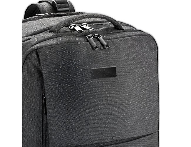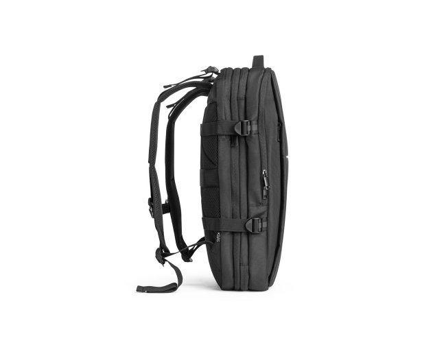Mochila de viagem em poliéster reciclado (rPET) 600D de alta densidade, com acabamento repelente à água. Composta por 3 compartimentos principais com forro em poliéster reciclado (rPET) 210D: compartimento traseiro com bolso para notebook até 17.3" e bolso para tablet até 10.1", compartimento central expansível com zíper destinado à arrumação de roupa e um compartimento frontal com vários bolsos interiores. Possui ainda três bolsos frontais, dois deles com forro em PEVA com dimensões distintas, ideais para colocar o seu squeeze, roupa molhada ou cosméticos. Além destas características, reúne ainda outros diferenciais como: placa metálica removível com ímã para fácil gravação, alças de ajuste que tornam esta mochila mais confortável, cintas de compressão nas laterais, pegas superiores e laterais almofadadas. A parte posterior incorpora uma alça para trolley em caso de necessidade. Capacidade até 29 L.