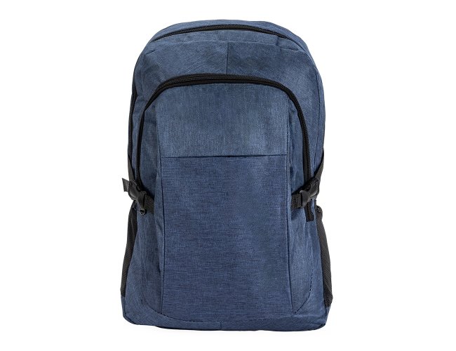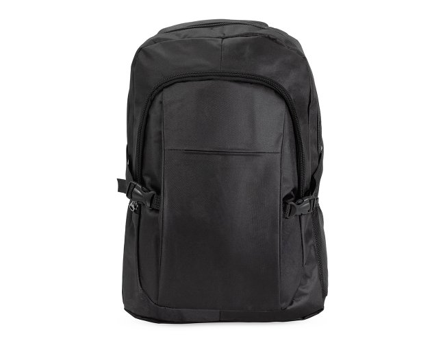 Mochila confeccionada em Oxford 300D resistente à água com capacidade máxima de 14 litros. Possui compartimento principal com divisória para organização de objetos internos e outro, localizado na parte frontal, com três bolsos internos em diferentes tamanhos. Conta ainda com bolsos laterais em tela de malha com elástico, um par de fivelas de engate lateral em plástico, alça superior em nylon e alças para as costas com revestimento externo em tecido respirável.